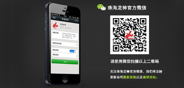 珠海龍神官方微信敬請(qǐng)關(guān)注! 2013-09-18 16597 珠海市龍神有限公司公共微信號(hào)已申請(qǐng)成功,請(qǐng)大家多多關(guān)注!掃描二維碼,也可直接搜索公眾微信號(hào)“珠海龍神”,我們將不定期發(fā)布公司最新資訊。您也可以發(fā)消息和我們進(jìn)行互動(dòng)。查看歷史消息收看您錯(cuò)過的動(dòng)態(tài)新聞,讓您第一手掌握最新動(dòng)態(tài)。