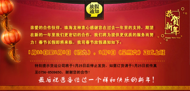 2014年春節(jié)放假通知 2014-01-16 10608 親愛的合作伙伴,珠海龍神衷心感謝您在過去一年里的支持,期望在新的一年里我們更密切的合作,我們將為提供更優(yōu)質(zhì)的服務(wù)而努力!春節(jié)長(zhǎng)假即將來臨,我司春節(jié)放假通知如下:1月26日至2月8日(初九),2月9日(星期六)正式上班。特別提示貨運(yùn)公司將于1月25日后停止發(fā)貨,如需訂貨請(qǐng)于1月25日前傳真至0756-8509650,謝謝您的合作!最后祝愿各位過一個(gè)祥和快樂的新年!