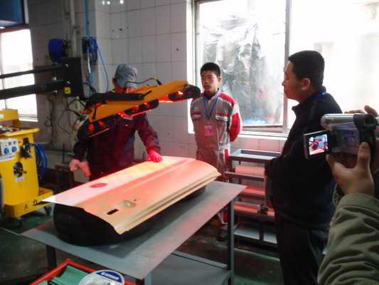參賽選手利用龍神公司提供的鈑噴設(shè)備進行實操