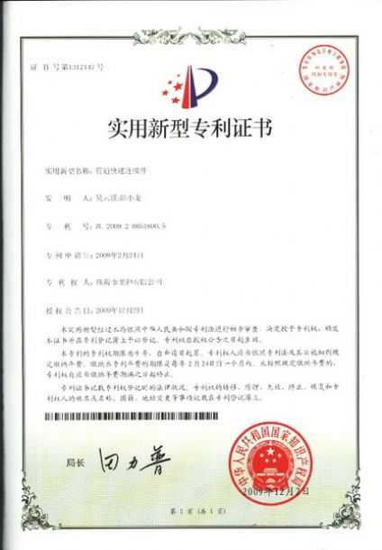管道快速連接件專利證書 |