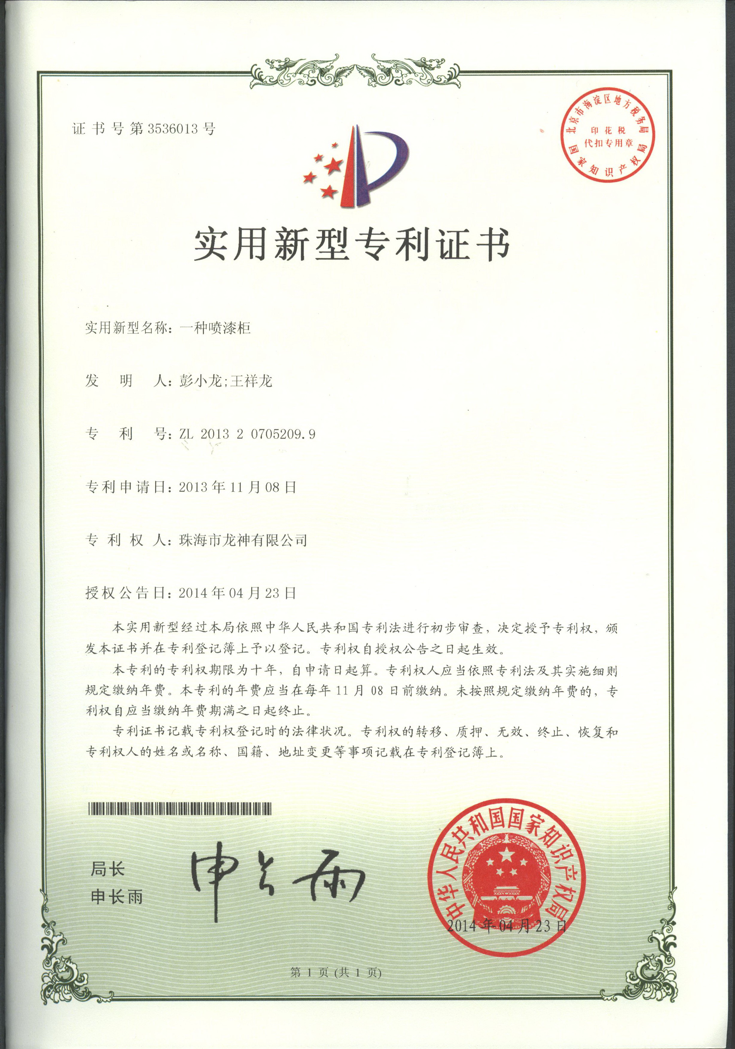 調(diào)漆裝置專利證書 | 噴漆柜專利證書 |