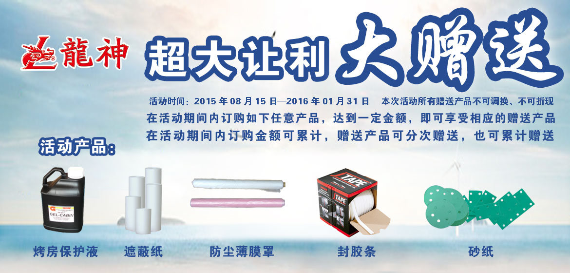 超大讓利﹒大贈送 2015-08-17 31771 訂購產(chǎn)品:1、烤房保護液; 2、遮蔽膜; 3、遮蔽紙; 4、泡沫膠條; 5、砂紙。 在活動期間內(nèi)訂購如上任意產(chǎn)品,達到下表累計金額,即可享受相應(yīng)的贈送產(chǎn)品。