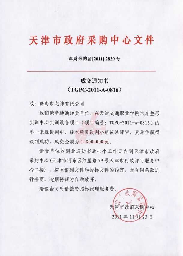 我們榮幸的通知貴單位,在天津交通職業(yè)學(xué)院汽車整形實訓(xùn)中心實訓(xùn)設(shè)備項目(項目編號:TGPC-2011-A-0816)的單一來源談判中,經(jīng)本項目談判小組依法審評,貴單位獲得談判成功,成交金額為1,800,000元。